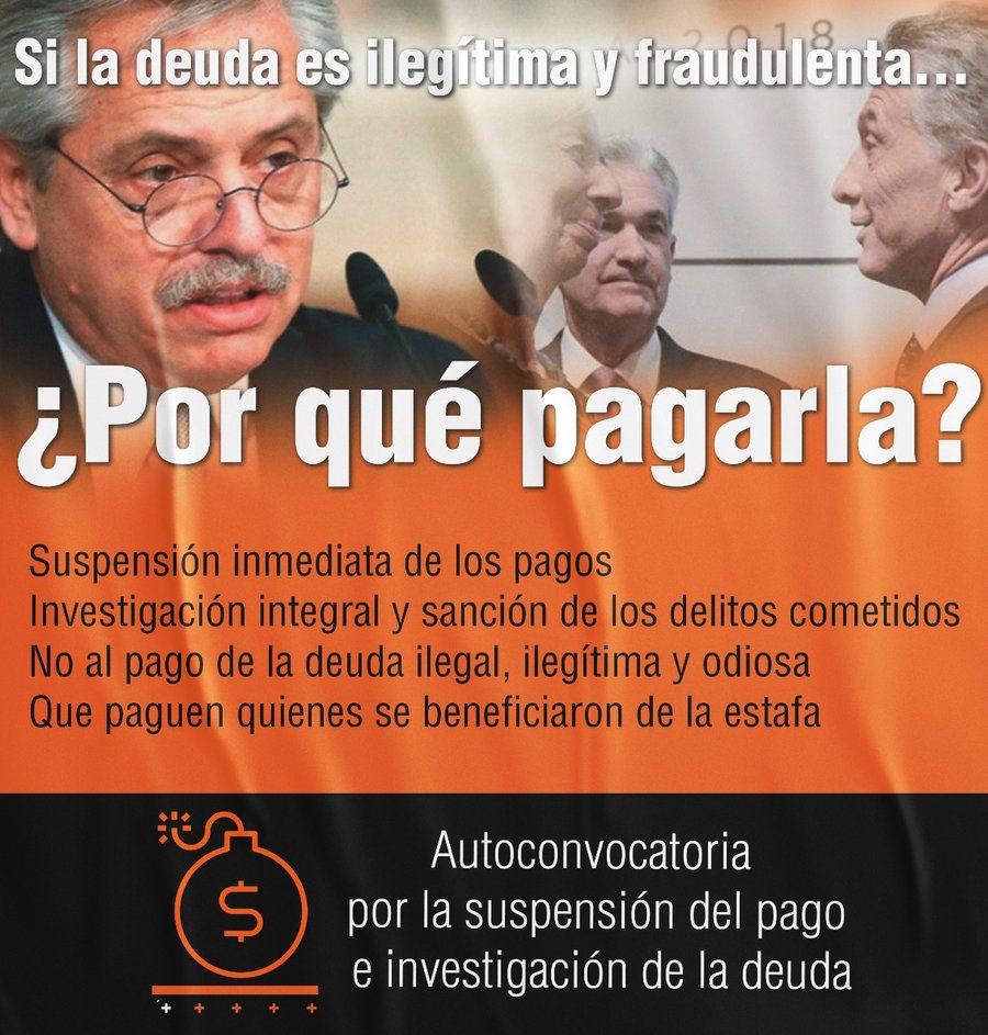 Desde la Autoconvocatoria por la Suspensión del Pago y la Investigación de la Deuda Externa impulsamos un Juicio Popular a la Deuda dando a conocer su Fallo al Pueblo Argentino en diciembre del 2020 en el que se afirma textual: “…LA NULIDAD ABSOLUTA DE LAS DEUDAS PUBLICAS Y LOS ACUERDOS CON EL FMI, no obstante su reiterada restructuración y afirmamos el derecho del pueblo y de la Nación a rechazar su pago, más aún en situaciones de extrema necesidad como la que actualmente se viven en el contexto de la pandemia del Covid-19. Además, a los efectos de poder llevar adelante UNA AUDITORIA INTEGRAL, CON PARTICIPACIÒN CIUDADANA, de la deuda pública y de los acuerdos firmados con el FMI, a fin de establecer la legalidad y legitimidad de los mismos, se peticiona con firmeza…” que “…Mientras se lleva adelante la auditoría antes referida, se tendrá que ordenar LA SUSPENSION DE LOS PAGOS DE LA DEUDA PUBLICA, HASTA TANTO NO SEA ESTABLECIDA SU LEGALIDAD Y LEGITIMIDAD”. (2)