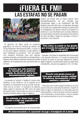 El gobierno de Macri tomó un préstamo gigantesco, de miles de millones de dólares, del Fondo Monetario Internacional (FMI). La plata no se usó para ninguna inversión, ni obra pública, ni para “estabilizar la economía”. Fue una estafa, una maniobra financiera para que algunas grandes empresas y empresarios se enriquecieran, fugando esos dólares al exteriormientras el pueblo argentino se empobreciera por una deuda que no es suya.