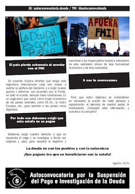 Discutir esta deuda eterna es clave para revertir nuestra realidad de pobreza, desocupación y crisis sanitaria y ambiental. Cada peso que va para pagar la estafa es un peso que se resta para solucionar el hambre o mejorar la salud, el agua, la educación. Es más plata para los especuladores y menos recursos para las mayorías; más extractivismo contaminante y menos cuidado de nuestros derechos y los de la naturaleza.